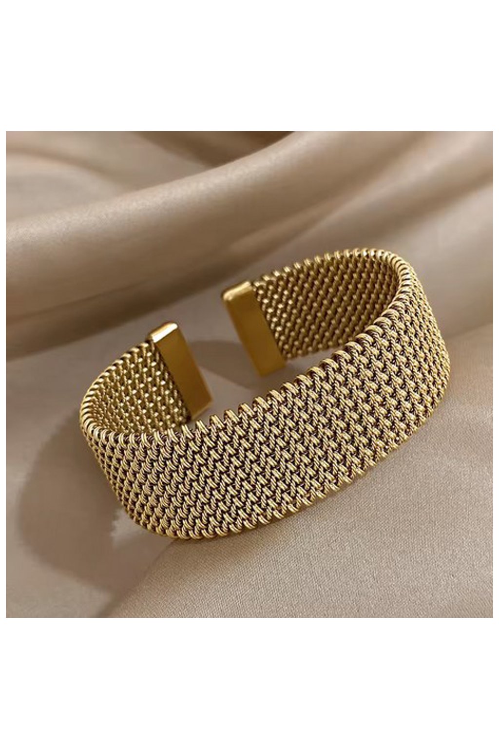 Elegantní náramek s jemným pleteným (mesh) vzorem je nadčasovým doplňkem pro ženy. Otevřený cuff design umožňuje pohodlné nasazení a lehké přizpůsobení zápěstí. Minimalistický, ale výrazný design se hodí jak k běžným outfitům, tak k elegantnějším příležitostem nebo večírkům.